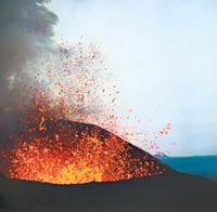 | Рений в виде минерала обнаружен нашими учеными почти случайно. На Сахалине в городе Южно-Сахалинске есть Институт вулканологии и геодинамики Российской академии естественных наук. Директор его - Генрих Семенович Штейнберг уже много лет организует научные геологические экспедиции с участием ученых из Новосибирска, Москвы, Иркутска и других городов. И вот во время такой экспедиции в 1992 году сотрудники Института экспериментальной минералогии (он находится в городе Черноголовка, под Москвой) и Института геологии рудных месторождений (Москва) вели режимное наблюдение на вулканах Южнокурильской гряды и на вершине вулкана Кудрявый на острове Итуруп в местах выхода вулканического газа нашли новый минерал - рениит. Внешне он напоминал обычный молибденит, а оказался сульфидом рения. Содержание рения в нем достигает 80%. Это было почти чудо - заявка на возможность промышлен ного использования рениита для получения рения. Вулкан Кудрявый высотой 986 метров - вулкан так называемого гавайского типа. В отличие от взрывающихся газовых вулканов он тихо тлеет. И в темную ночь, заглянув в кратер, вы можете увидеть в глубине раскаленную ярко-красную лаву |